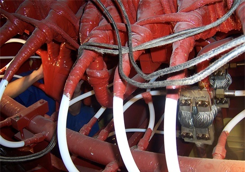發(fā)電機(jī)下方的出線側(cè)連接螺絲都是純銅鍍銀的下方接封閉母線從發(fā)電機(jī)到變壓器的連接線都是封閉母線封閉母線會(huì)通正壓氣體,防止灰塵進(jìn)入這個(gè)銅塊很沉的這是發(fā)電機(jī)出線,絕緣包纏做絕緣之前是這個(gè)樣子的發(fā)電機(jī)的電流互感器安裝在藍(lán)色內(nèi)部白色的是純凈水管,用來(lái)冷卻發(fā)電機(jī)定子這是定子鐵芯和繞組。